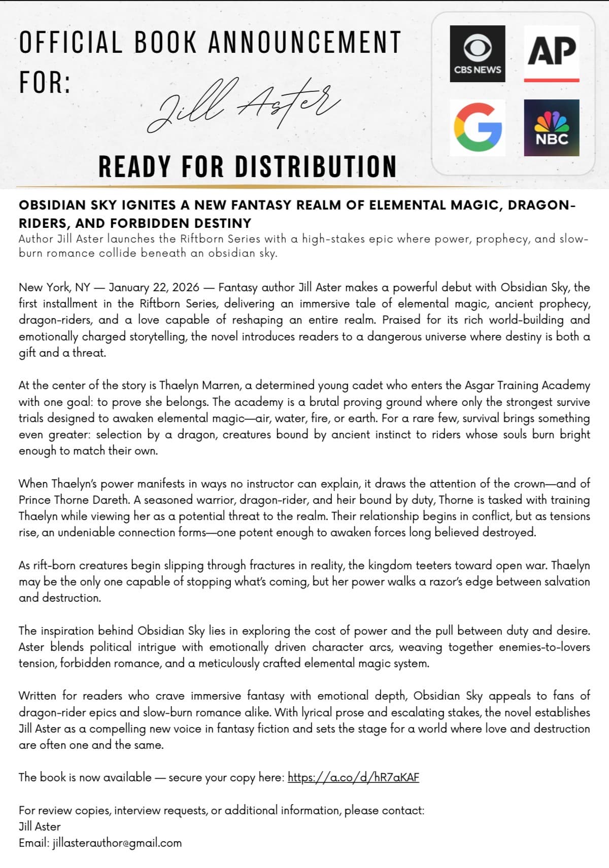 Your debut novel, Obsidian Sky, immediately stood out for its ambitious scope and richly layered fusion of epic fantasy and slow-burn romance. From the elemental magic system and ancient prophecies to the high-stakes political tension and dragon-rider lore, you have crafted an immersive world that feels both expansive and intimate. Thaelyn Marren’s journey, marked by power she does not yet understand and a destiny she never sought, is compelling, fierce, and deeply human.